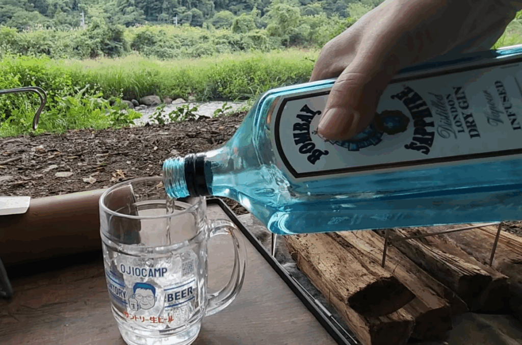夕暮れ時になり、今日の宴の準備を始めます。まずはジントニックを作ることにしました。ここで使ったライムは、実はキャンプ仲間のバーバパパさんが、ご自身の庭で採れたものを送ってくださったものです。新鮮なライムの香りがボンベイサファイアと混ざり合って、最高の一杯になりました。