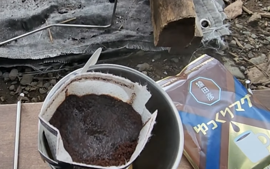 翌朝、霧に包まれた静かな朝を迎えました。焚き火を再び起こして、ドリップコーヒーを淹れます。朝食は、富士そばのインスタント麺を、新しいLAGOMのテーブルアタッチメントの上でいただきました。