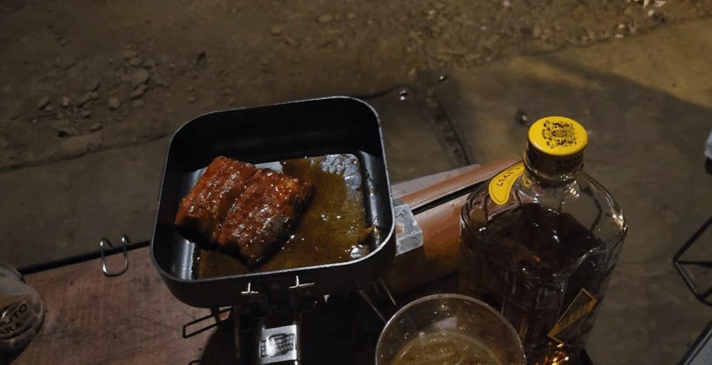 夕方になったら、夏の定番であるうなぎを焼きました。黒い鉄板で丁寧に焼き上げたうなぎの香ばしい香りが、キャンプサイト全体に広がります。夜になるにつれて気温も下がり、ウイスキーに切り替えて、ゆっくりとした時間を過ごしました。