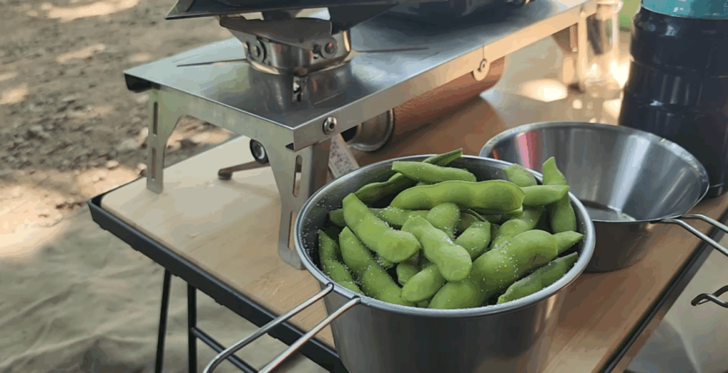 枝豆も夏キャンプの定番です。今回は「おじお流」の調理法で、塩加減とゆで時間にこだわって作りました。ビールのお供には最高の一品です。