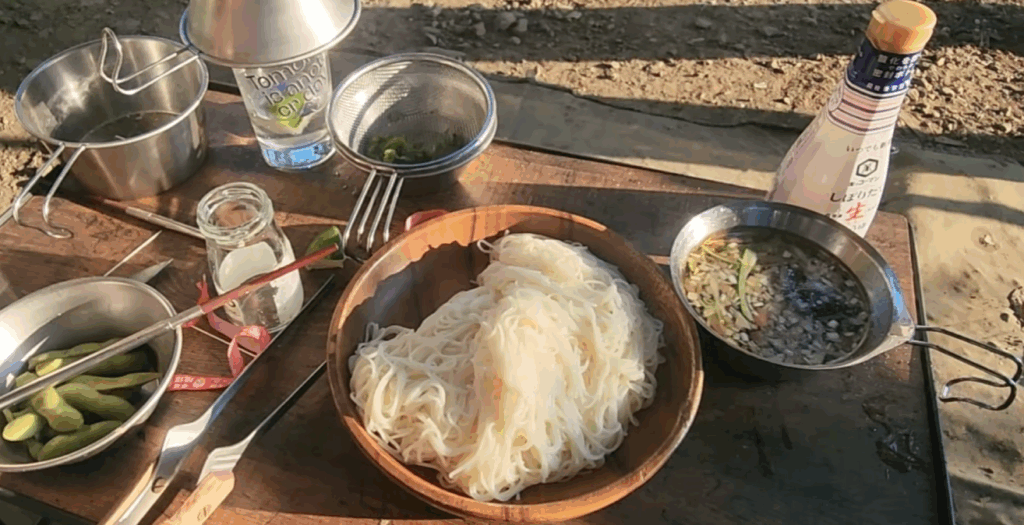 暑い夏といえば素麺です。今回は特製のつゆでいただきました。四角型のメスティンで茹でた素麺を、冷たい川水で締めて、シンプルながらも絶品の仕上がりになりました。外で食べる素麺は格別ですね。