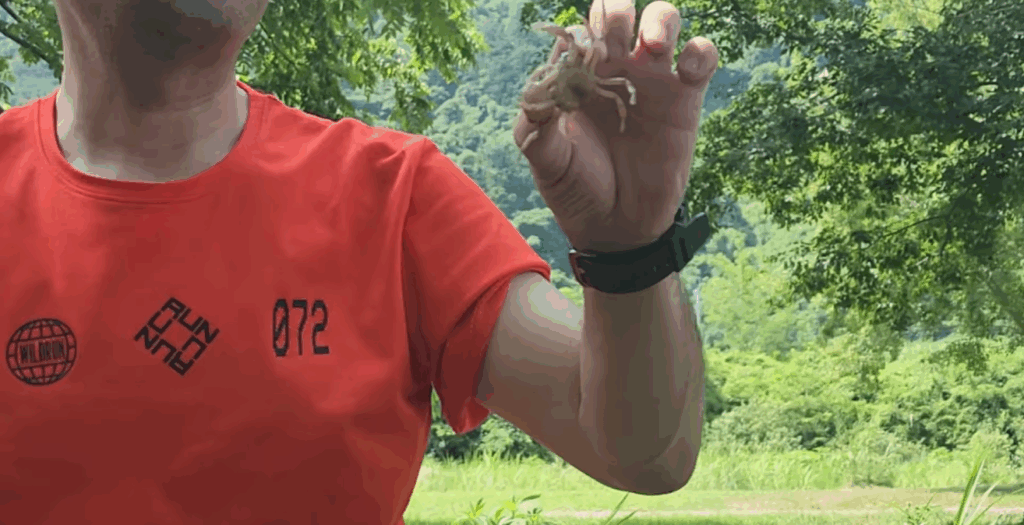 朝食後、友人が川で遊び始めました。まるで少年のように水しぶきを上げて遊ぶ姿は、見ているこちらも楽しくなりました。そして驚いたことに、小さな沢蟹(サワガニ)を捕まえることもできました。大人になっても、こうした自然との触れ合いは心を豊かにしてくれますね。