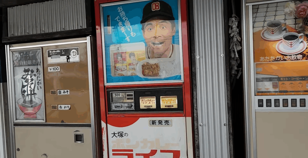 数十台もの懐かしい自販機が並ぶ光景は圧巻です。ボンカレーやうどん、トースト、ハンバーガーまで、様々な昭和グルメの自販機が現役で稼働しています。私たちはうどんを購入して、その場でいただきました。昭和の味を堪能しながら、今回のキャンプ旅行の素晴らしい締めくくりとなりました。